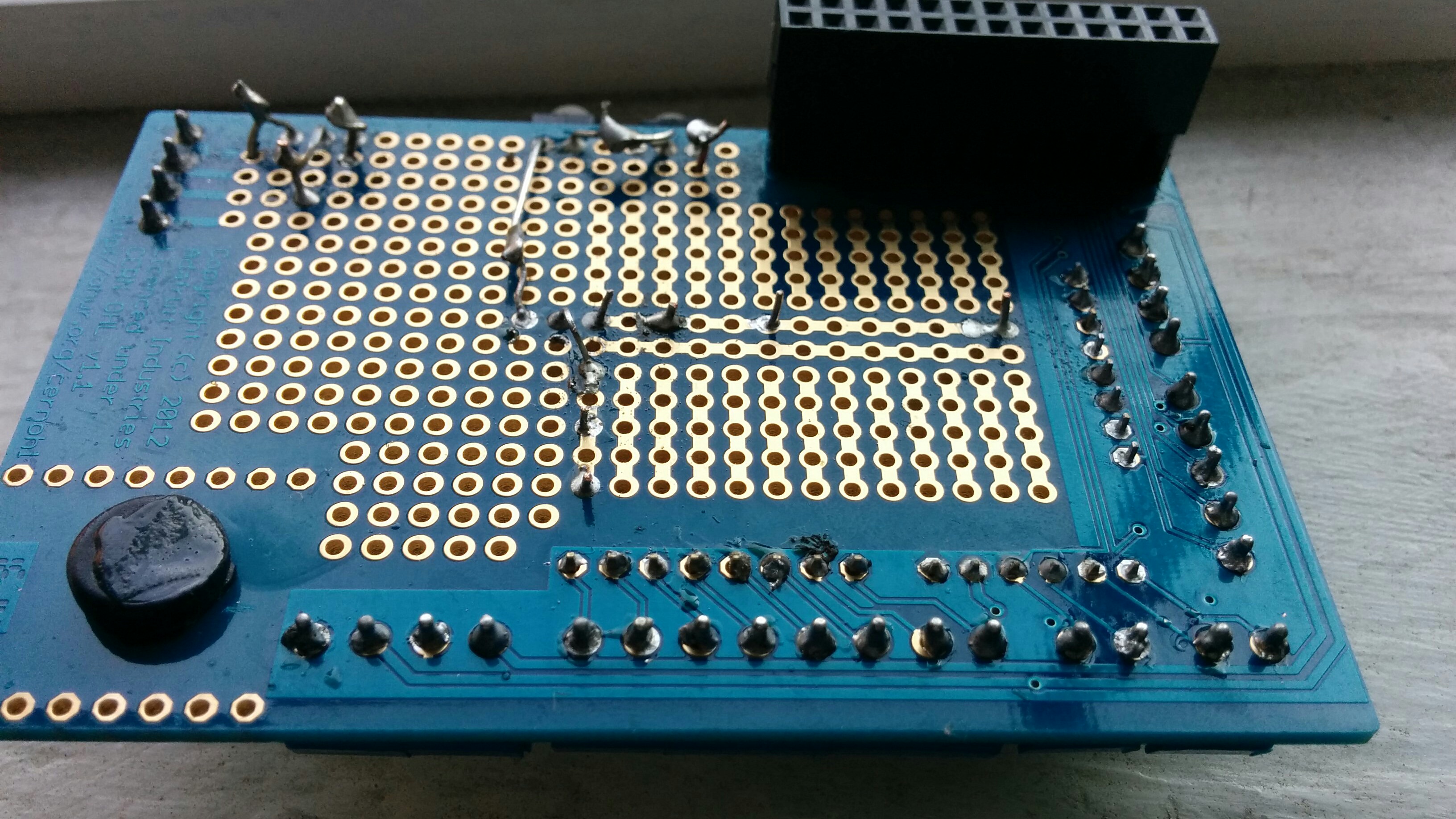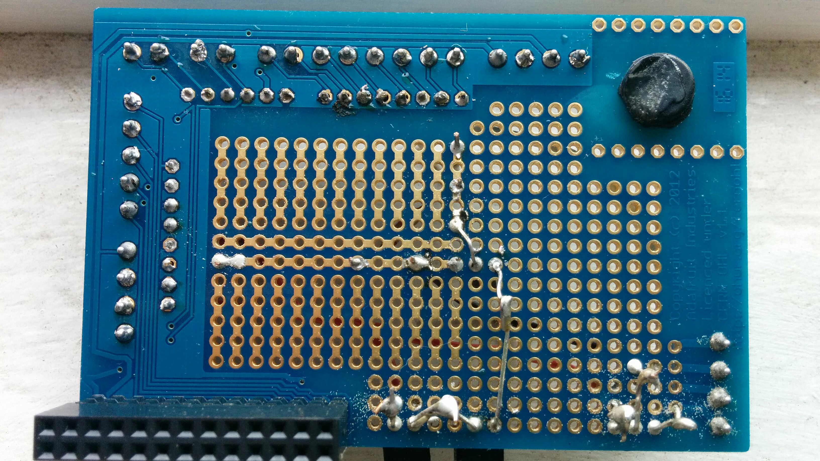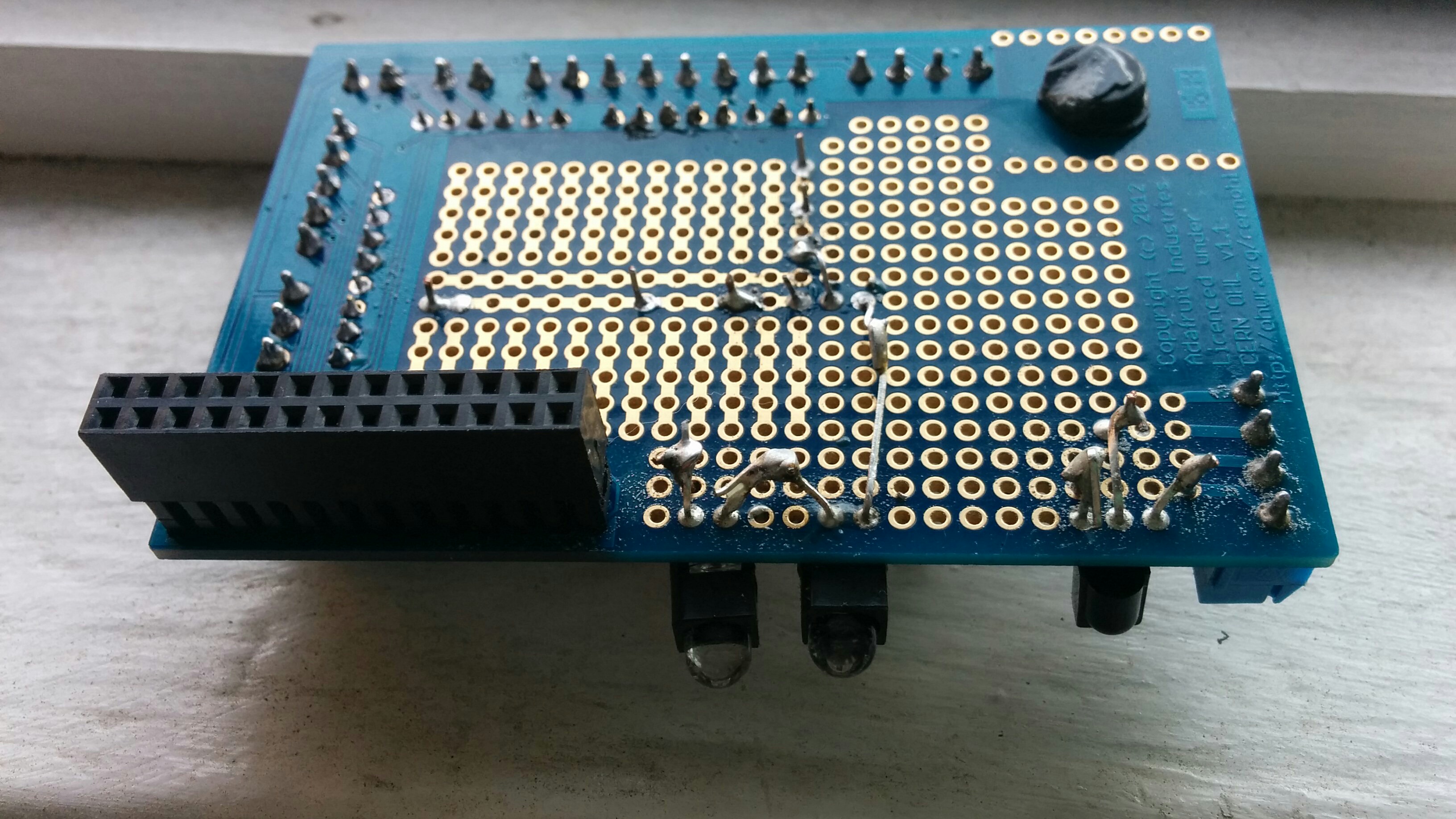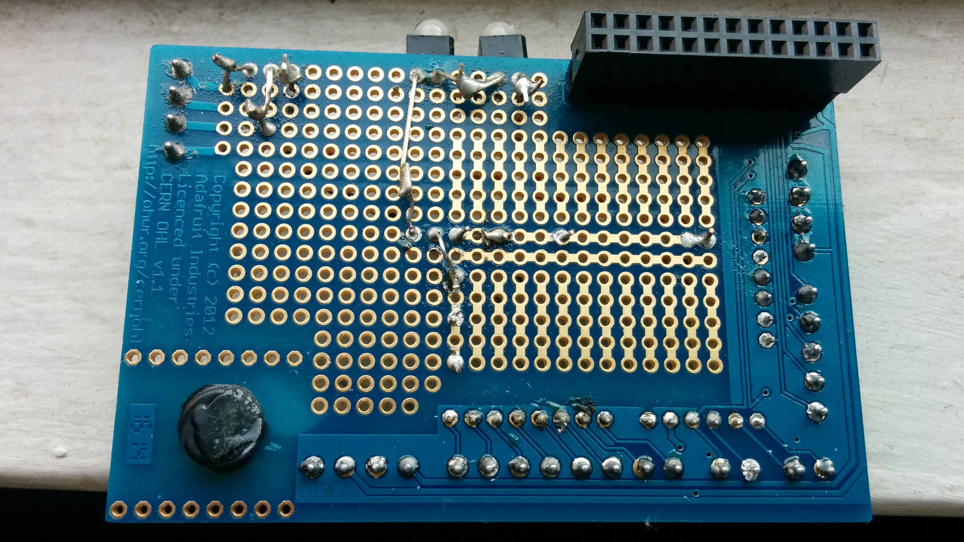 Here are a bunch of photos of how I set up the circuit on the proto board. I’ve tried to take many photos from multiple angles and orientations, so you can tell what goes where. As you can see, I’m a novice solderer, and please excuse the dust that has accumulated on the proto board 🙂