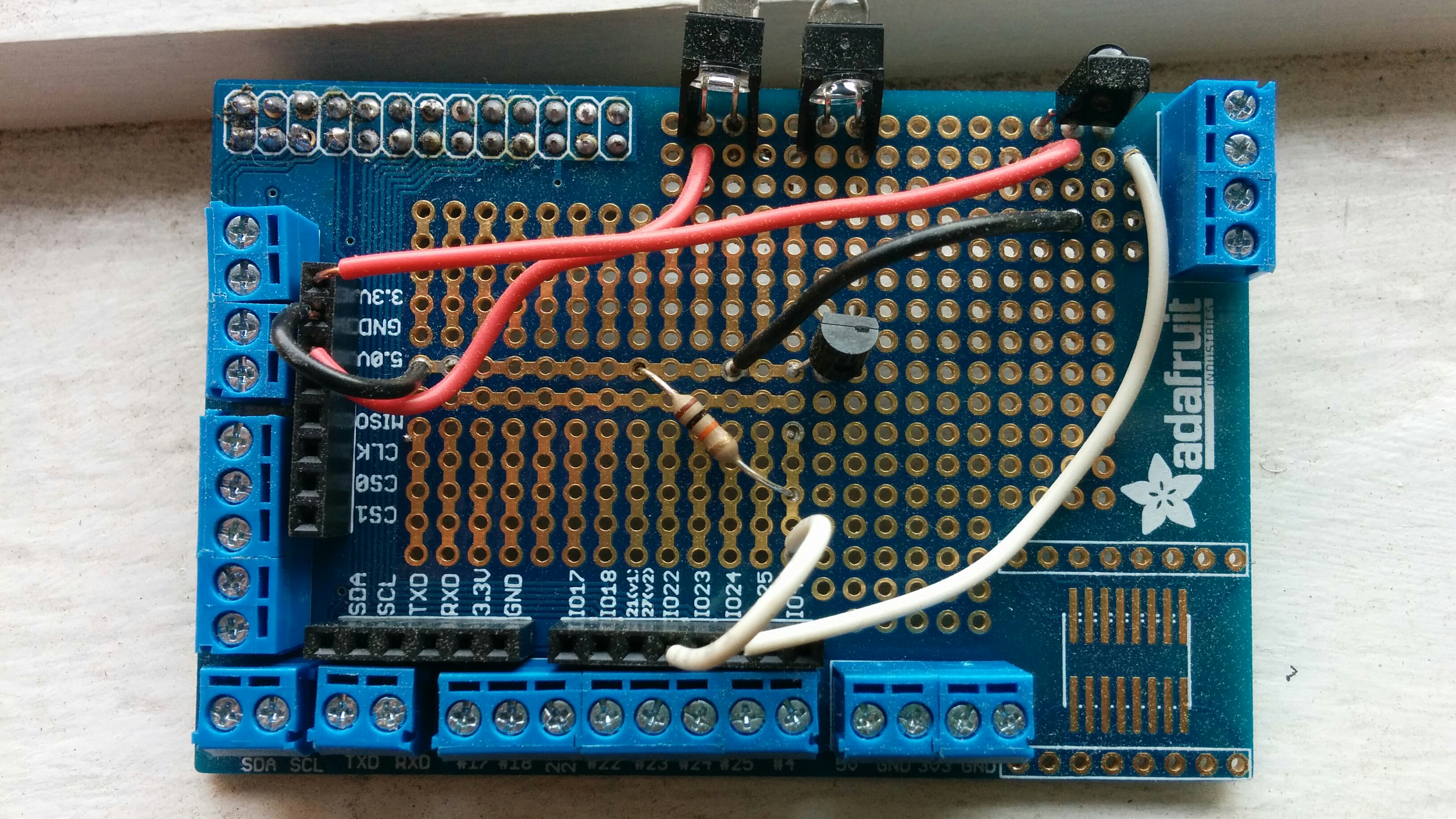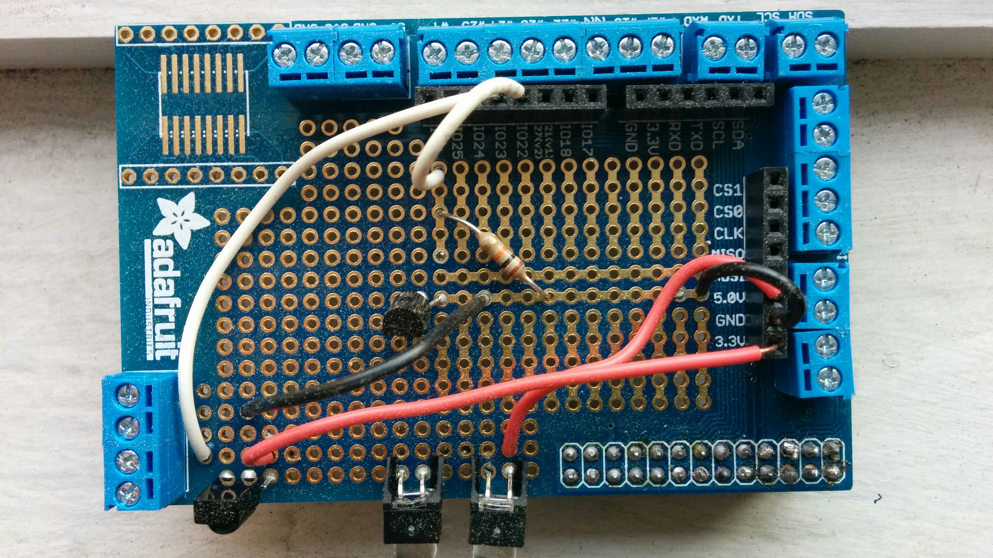 While my circuit is equivalent to Alex Bain’s, the exact position of the components on the proto board is different. This is primarily to cut down on the amount of soldering I had to do. See the images below.